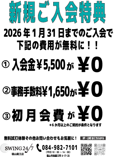 お知らせ 2025.12.22 新規入会特典 新規入会特典のご案内! 2026年1月31日までにご入会の方は、 ①入会金通常¥5,500が無料に! ②事務手数料通常¥1,650が無料に! ③初月会費が無料に! 但し、6か月以上のご契約が条件となります。 ぜひこの機会に試打体験にご来店ください!!