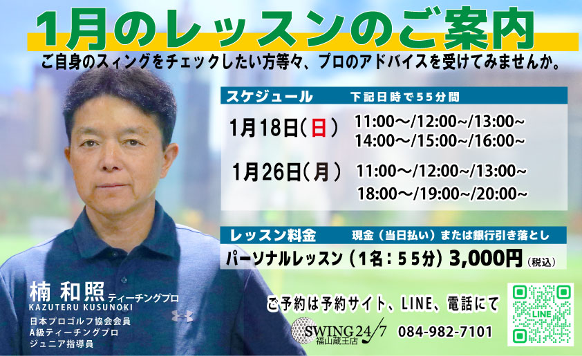 お知らせ 2025.12.7 1月のレッスンのご案内 スィングのチェックや、迷いのある方等々、プロのアドバイスを受けてみませんか・・。 講師楠 和照ティーチングプロ日程①1月18日(日)11時・12時・13時・14時・15時・16時の6枠②1月26日(月)11時・12時・13時・18時・19時・20時の6枠料金3,000円(税込) ※全て個人レッスンです。※おひとり様1枠(55分)※ご予約は、予約サイトもしくは、LINEまたは電話でのご連絡でもOKです。※会員以外の方の参加もOKです。