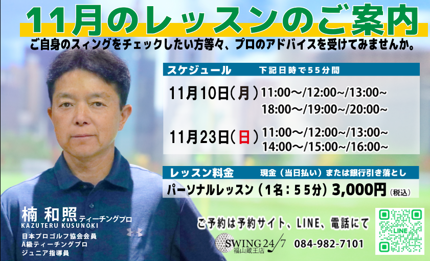 お知らせ 2025.10.24 11月のレッスンのご案内 スィングのチェックや、迷いのある方等々、プロのアドバイスを受けてみませんか・・。 講師楠 和照ティーチングプロ日程①11月10日(月)11時・12時・13時・18時・19時・20時の6枠②11月23日(日)11時・12時・13時・14時・15時・16時の6枠料金3,000円(税込)※全て個人レッスンです。※おひとり様1枠(55分)※ご予約は、予約サイトもしくは、LINEまたは電話でのご連絡でもOKです。